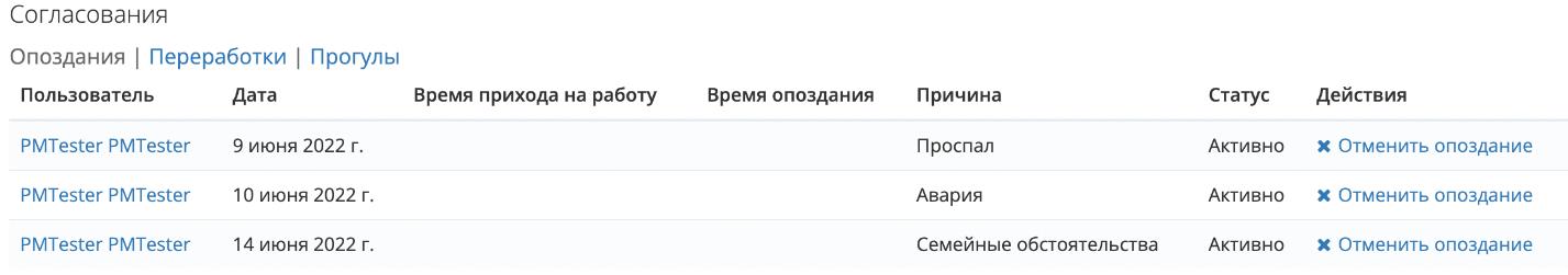 Согласования Блок для управления опозданиями, переработками и прогулами, т.е. неожиданным поведением сотрудников. Данные оформлены в виде сводной таблицы. Статус можно согласовать или отменить.