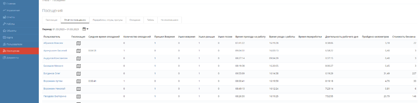 Здесь также есть ссылка на трек сотрудника, но в первую очередь здесь собрана аналитика по посещениям объектов за выбранный период (от одного дня):