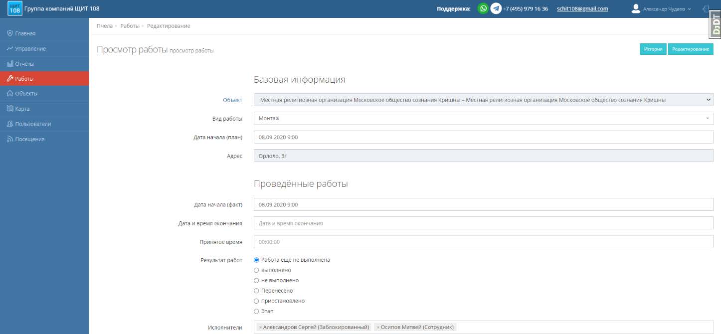 - Указать фактическую дату окончания, информацию о проведённых работах, примечания